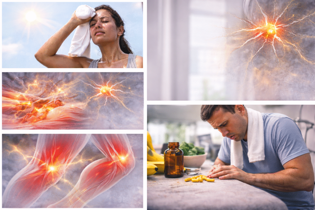 Bajos niveles de potasio, magnesio, calcio y sodio son una causa habitual de calambres. Estos minerales son esenciales para la contracción y relajación muscular. Cuando faltan, los músculos se irritan fácilmente y se contraen sin control.