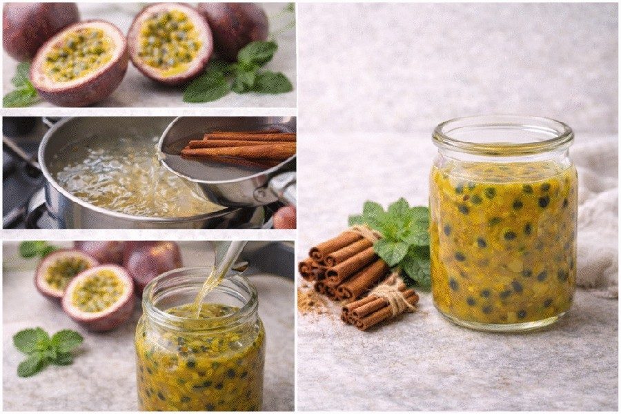 • Añade el jugo de chinola y el jugo de limón al agua hervida, ya retirada del fuego.